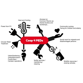 Coop4PEDs is a project to decarbonise urban neighbourhoods towards PEDs through the creation and promotion of cooperatively organised energy resource communities that build and operate shared resource systems within a PED. The project targets many of the challenges that cities face when aiming to achieve climate neutrality: