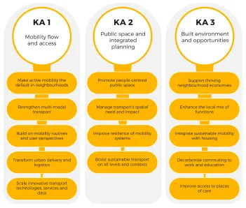 The 15mC TP focuses on three Key Areas of Action (KAs): Mobility flow and access, Public space and integrated planning and Built environment and opportunities.